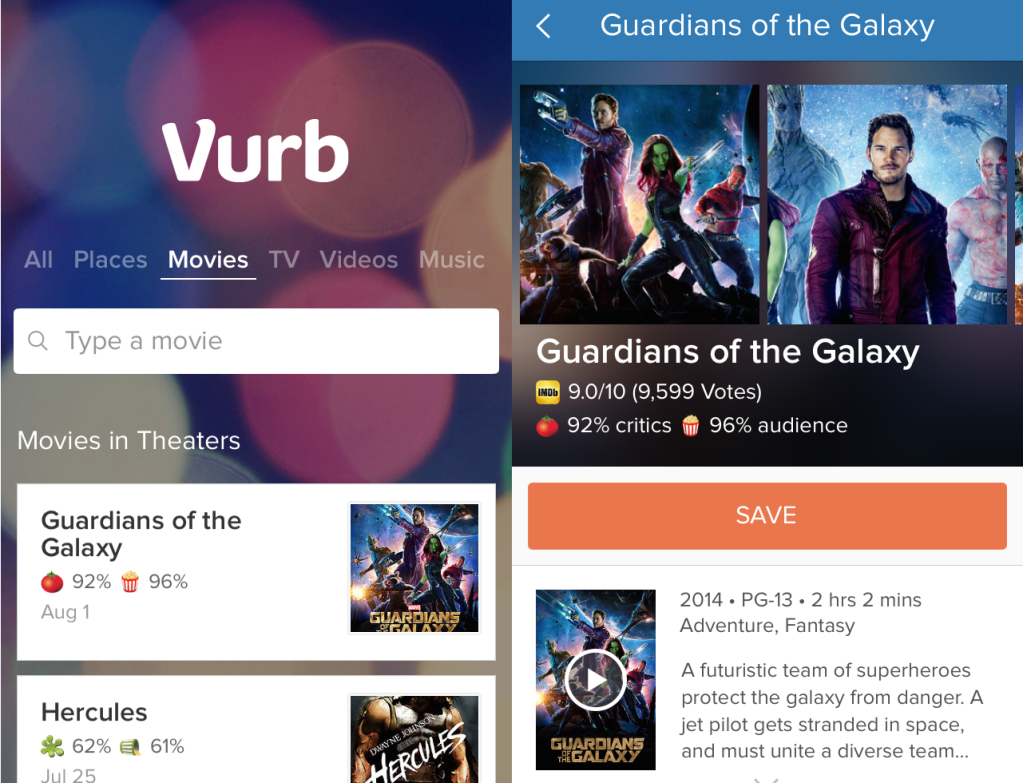 Vurb is different. Search for a movie, and you’ll get IMDb, Rotten Tomatoes, and Flixster scores, nearby showtimes, trailers, cast breakdown, reviews. But say you choose a theater and click through to buy tickets for a specific showtime. One more click of Vurb’s Nearby Places button will show you top restaurants and bars close to the theater that you can filter by type, price, and more variables. Find a nice eatery and Vurb will pull up menus, maps, and an OpenTable booking button.