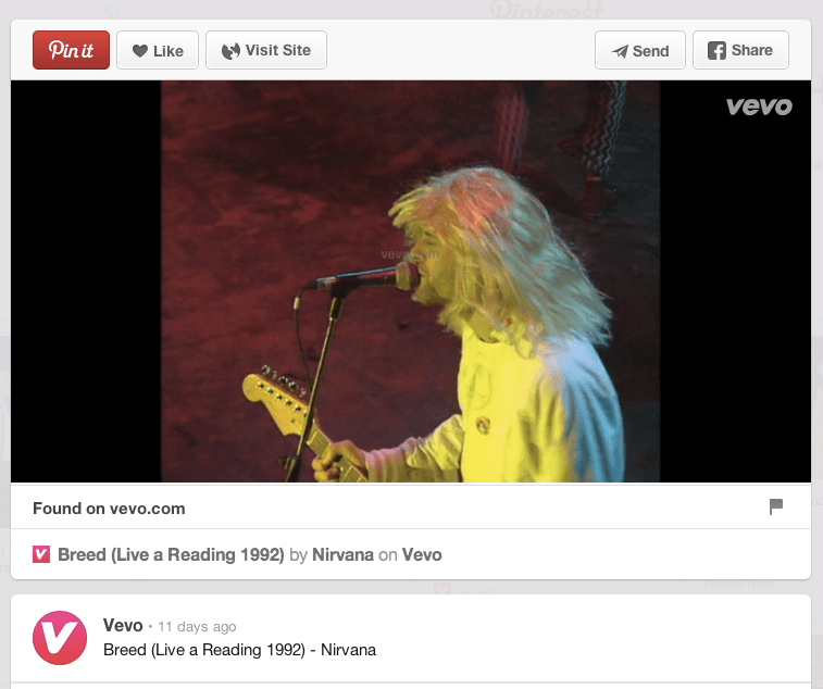 Make way for more content coming to Pinterest: today the platform is adding Vevo music videos, which you can search for, share, and watch on Pinterest itself, on your own Pinboards, those of your friends, or on Vevo’s.