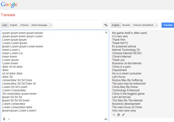 Now here comes the weird part: today Brian Krebs wrote about a glitch in Google Translate that automatically turned Lorem Ipsum (in various permutations) into decidedly modern and nefarious-sounding English. Lorem ipsum became “China.” Ipsum lorem became “Internet” and “lorem lorem” translated to China’s Internet. There were a few more, but sadly for us conspiracy buffs Google has changed Translate to actually translate the text directly.