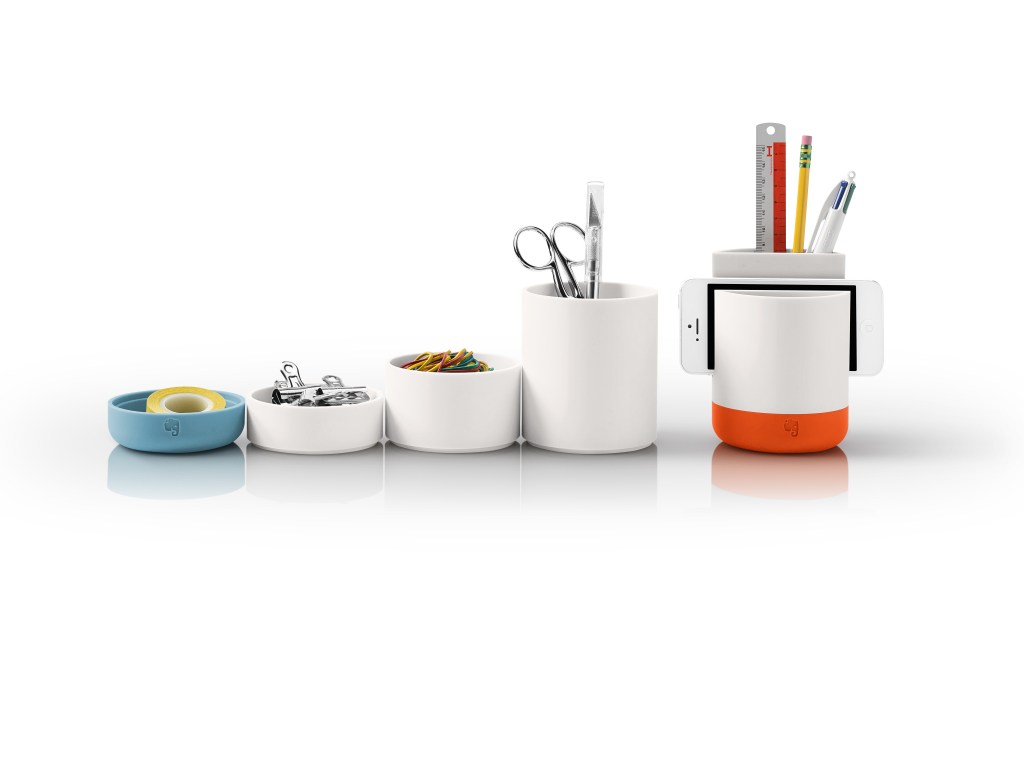 The first products, desktop accessories like the cups pictured above designed in partnership with Evernote’s Jeff Zwerner (who is also an Apple alum) are hitting Evernote’s virtual shelves now. Larger pieces, like objects to hold your phone, tablet and other devices pictured below, will coming later in the year, most likely to coincide with Evernote’s big Trunk conference in October.