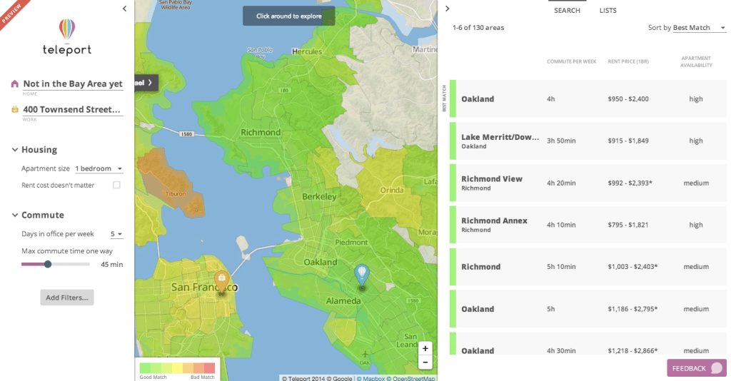 As a first step, they’ve launched a tool for Bay Area workers to figure out the best places to live. It asks where you currently work, and where you currently live and makes suggestions about neighborhoods that could be cheaper without severely diminishing quality of life. You can add in extra parameters like whether there is access to the outdoors, nearby train stations or gyms and yoga studios.