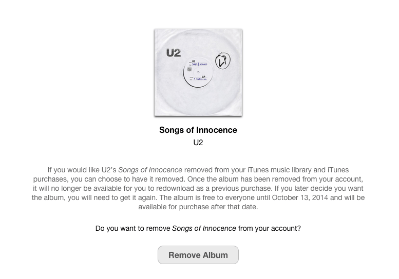If you would like U2’s Songs of Innocence removed from your iTunes music library and iTunes purchases, you can choose to have it removed. Once the album has been removed from your account, it will no longer be available for you to redownload as a previous purchase. If you later decide you want the album, you will need to get it again. The album is free to everyone until October 13, 2014 and will be available for purchase after that date.