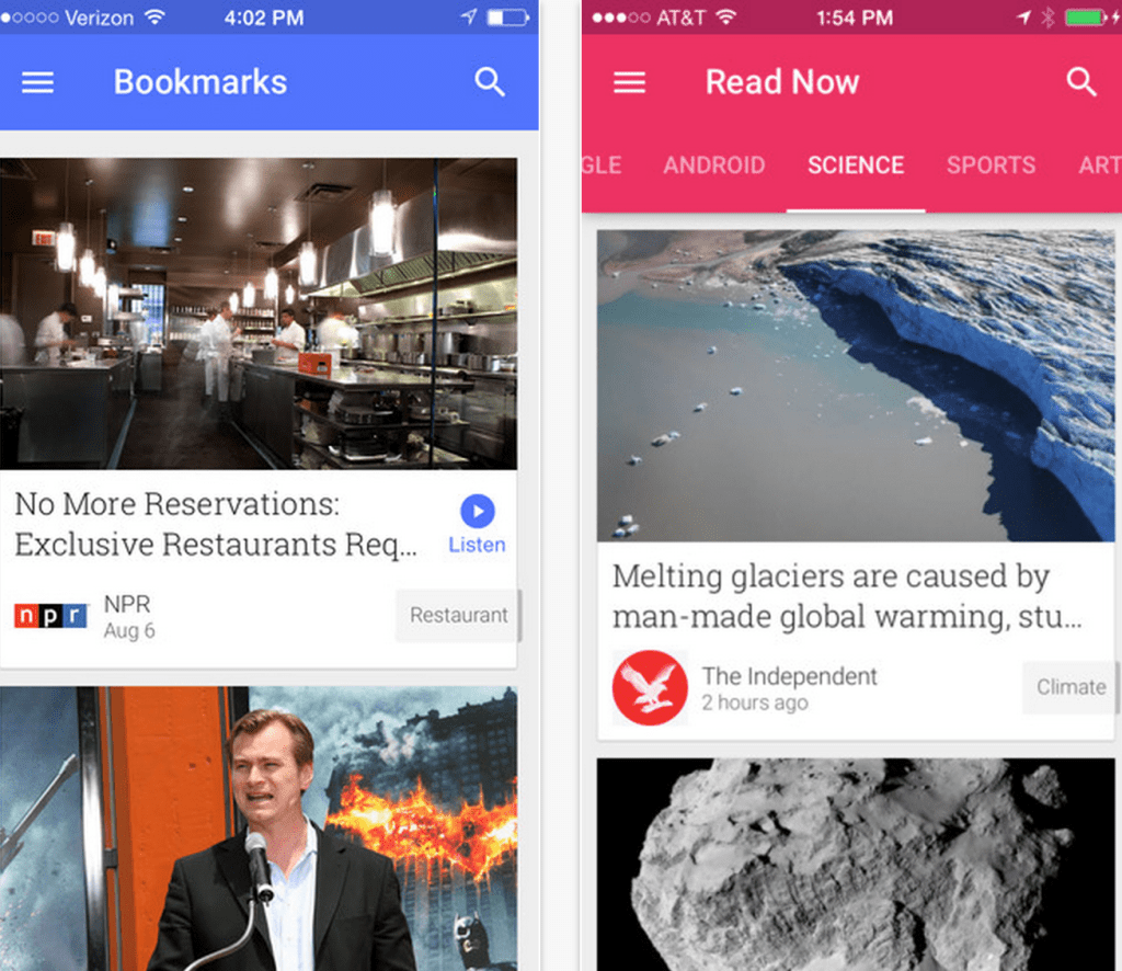 The revamped app is rolling out now on iOS, replacing Google Currents. Meanwhile the Android version remains listed on Google Play, but tells visitors that Newsstand is the new home and Currents is “no longer available for download or use.”