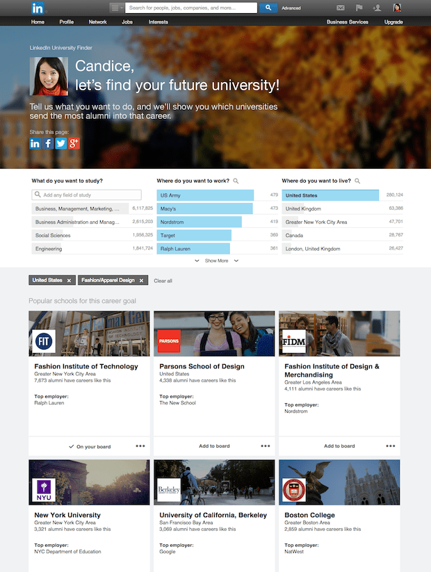 Last year, LinkedIn widened the net for potential users when it started to allow high schoolers to join its social network for professionals, and today it’s launching a clutch of features that it hopes will get them to stick around a while longer: three new tools — Decision Boards, University Outcome Rankings and University Finder — focus on college-bound students who are deciding where to apply, what to study and people who might give them some useful advice on the way.