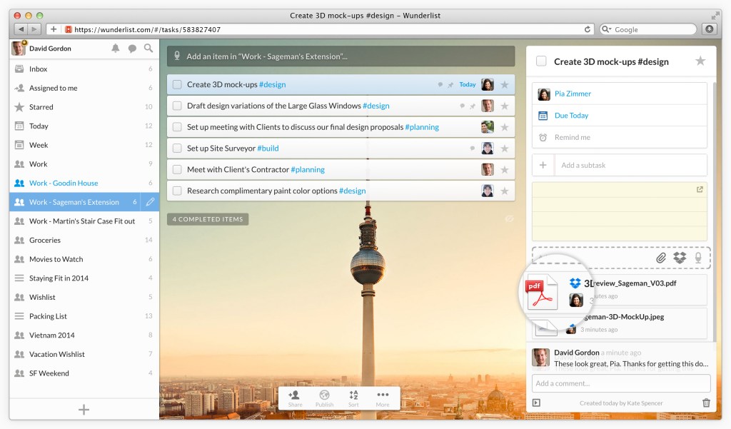 Second, it is the first of more integrations to come: “This is the kick off for more to come,” Benedikt Lehnert, the chief designer at 6Wunderkinder (the startup that makes Wunderlist). “With Dropbox, we have the most requested integration done.” Next up, from what I understand, will be integrations with other organising apps like Evernote, calendars from others like Google (right now you can export to Google’s calendar but you cannot import), and other third party apps that rely on you planning and scheduling things.
