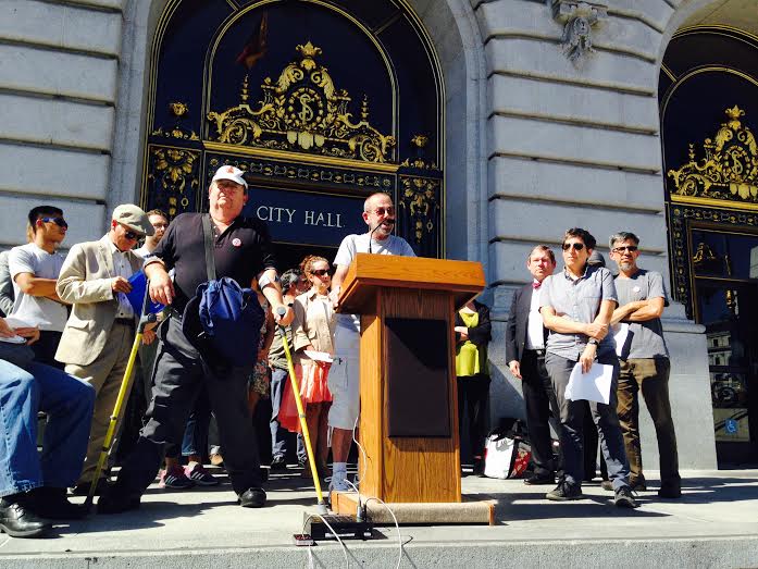 A broad group of protesters representing various San Francisco housing interests met on the steps of City Hall today to express their opposition of proposed legislation that would allow residents to rent out their homes on a short-term basis.