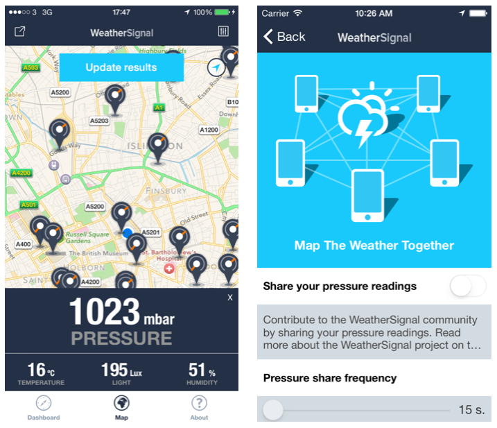 WeatherSignal has already seen a fair degree of popularity on Android, with 270,000 downloads since launching in May last year. It’s only coming to the iPhone now because the iPhone 6 models are the first to contain sensors for barometric readings, making it the first time that iPhone handsets can be used for crowdsourced meteorology.