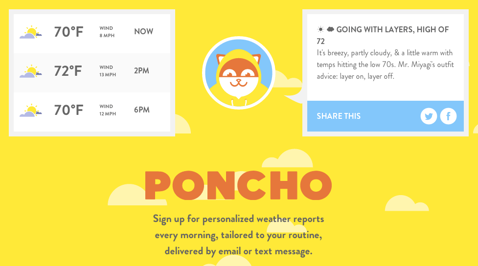 At the start of every day, most people check the weather. They go to the weather app on their phone, or open up weather.com, or perhaps they lick their finger and stick it out the window. I, however, get my weather updates from Poncho.
