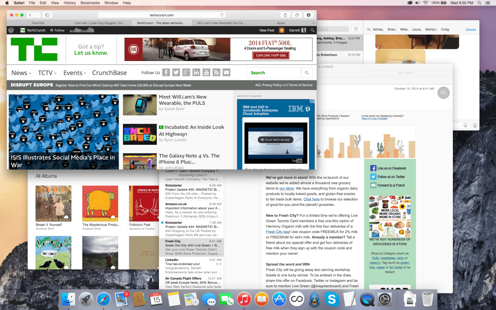 OS X Yosemite brings one of the biggest changes to Apple’s desktop operating system in the past decade, thanks to a redesign of app toolbars, as well as a new system-wide font, a brand new dock design and the addition of translucency across system elements to give you a subtle peek at what’s behind your active software, and what’s on your desktop. There’s also an option to switch to a new dark menu bar and dock, which seems like a very small thing, but in practice is actually quite useful if you spend a long time staring at your computer each day.