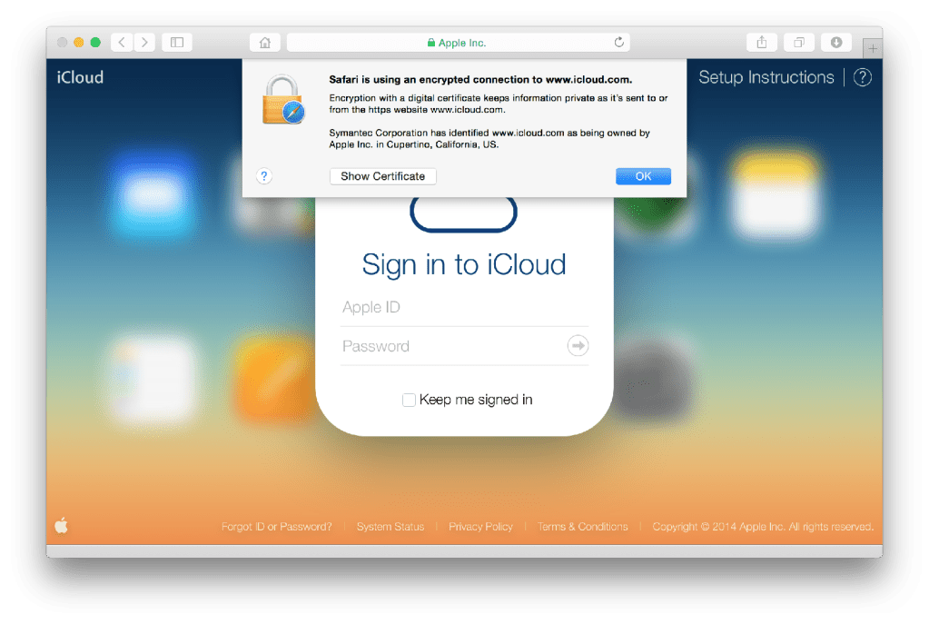 It does provide tips about how to ensure you’re connected to iCloud proper, and not a redirected spoof site designed to lure you into revealing your credentials. In Safari, that means validating the certificate via the green address bar title and the message revealed when you click the lock icon, and in Chrome that means check the green lock icon next to the address owner name to verity that it is indeed Apple. Apple also details the errors you’ll see if there isn’t a secure connection possible.