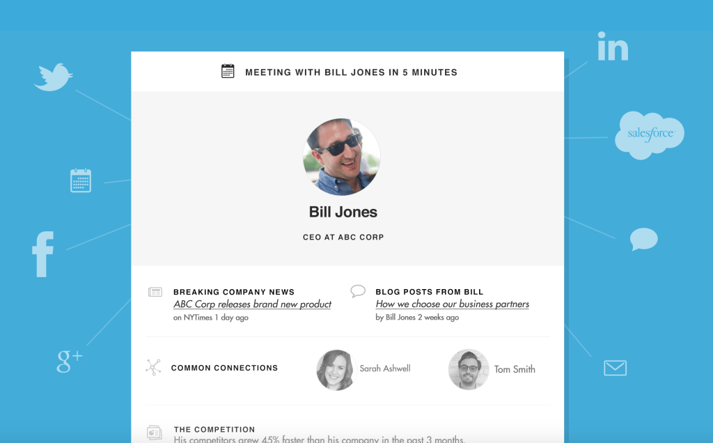 To use Charlie, you just connect the app with your Google account so it can access your calendar, as well as your accounts at other social networks. Then, an hour before your meeting, the service will send you a digest with information drawn from over 100,000 sources, including social sites like Facebook, Twitter and LinkedIn, plus news via Google News and more. It will show you things like that person’s latest blog posts, which connections you have in common, company and competitor news and stats, and even common interests, in case you have a need to make a more personal bond.