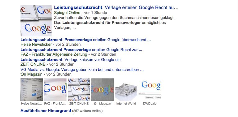 When the ancillary copyright law came into force in Germany in summer 2013 several major German publishers initially opted not to pull their snippets from Google, presumably fearing the impact of doing so on their traffic — given that other publishers’ snippets would inevitably become more visible in search results.