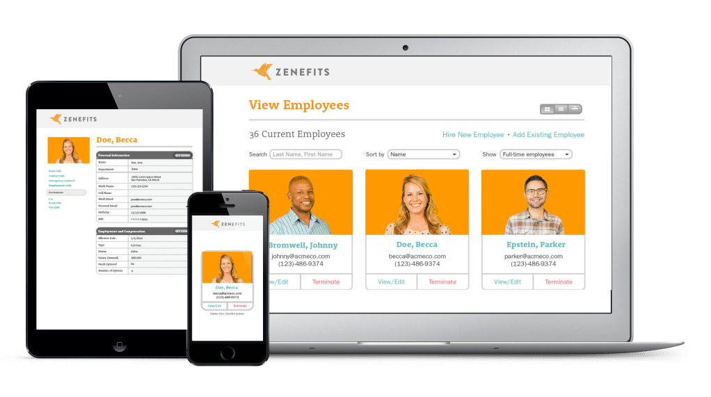 Zenefits provides a cloud-based dashboard to HR departments designed to help small businesses manage hiring, termination and all the benefits and payroll details necessary in-between those events. The product is offered for free and enables its users to easily onboard new hires by entering their relevant information once and then handles all relevant tax, insurance, payment and other processes seamlessly.