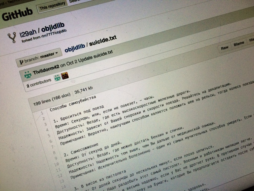 Developers in Russia are putting up their feet today — that is, after they have finished stomping around in frustration for a little while. It’s emerged that Russia’s regulator RosComNadzor has blocked GitHub after the popular software and coding collaboration platform was found to be hosting content related to suicide — specifically, see this file that details 32 ways to kill yourself.