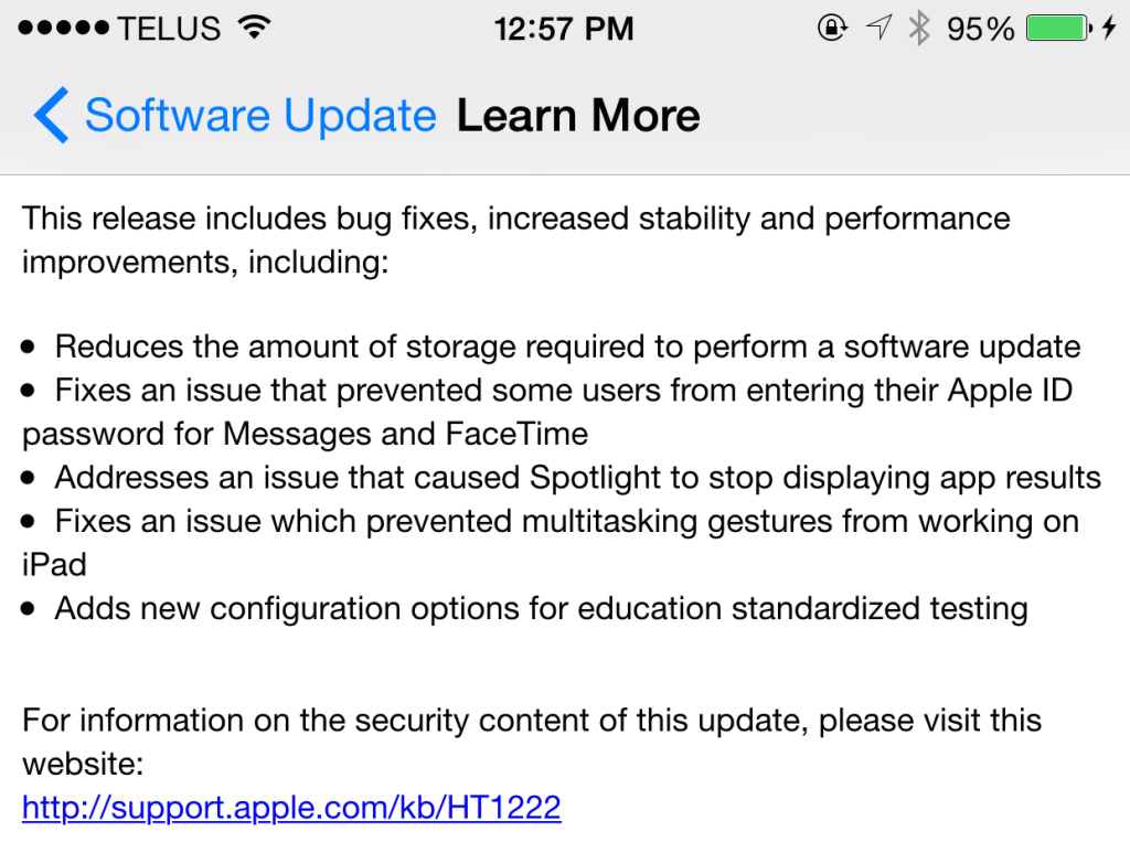 Apple has also fixed a bug that blocked users from inputting their Apple ID password for use with Messages and FaceTime, and another issue that stopped multitasking gestures (3- and 4-finger gestures for switching apps and returning home) from working correctly. Also new is a configuration option for use in educational deployments of iOS devices that adds support for standardized testing performed via Apple’s mobile devices, which likely allows them to be put in a sort of education-specific terminal mode.