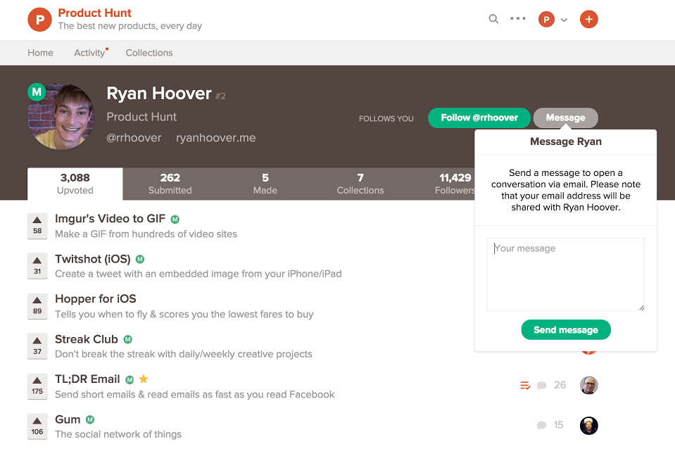 Product Hunt will be testing the feature with just a few whitelisted individuals for now. Those with access to the feature will see a “Message” button on the top right of someone’s profile page. You can click the button to send anyone with a profile a message on the site.