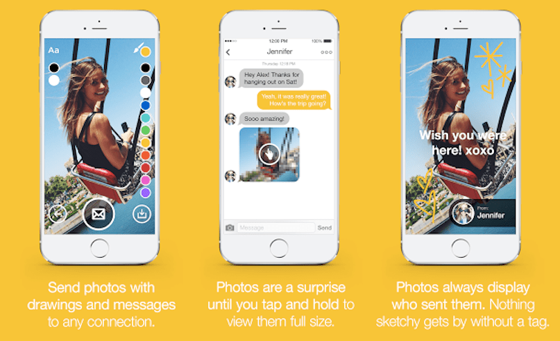 When a user sends a photo message, two things happen instantly. The first is that the photo is blurred unless the user is holding down on the screen, Snapchat style. Whenever the user is holding down and the photo is clear, it’s water-marked with the the sender’s name and a picture of their face. This prevents anyone from sending something that they wouldn’t want forever attached to their identity online.