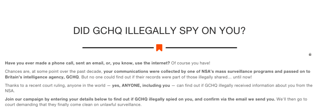 This only applies to retrospective snooping by the British — which is what the court in question, the Investigatory Powers Tribunal (IPT), deemed GCHQ to have improperly engaged in. So no, you can’t use this campaign to ask whether the U.K. intelligence agencies are spying on you now.