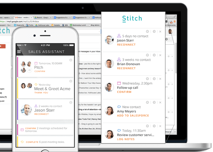 The acquisition is interesting, given Salesforce’s acquisition last year of RelateIQ for just under $400 million. Like RelateIQ and others in the space like Clari, the idea behind Stitch is not only to intelligently group, sift through and provide analytics on email and other cloud-based documents to make them more useful for salespeople on the move, but it’s also trying to apply big data and intelligent algorithms to surface better sales opportunities for its users.