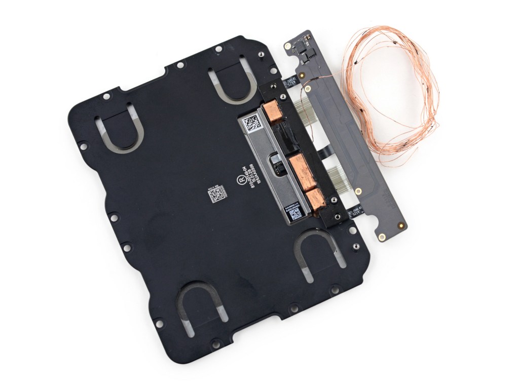 As Matthew Panzarino explained in an earlier post, the new trackpad design actually doesn’t move – or only moves on a microscopic scale – yet feels like the existing clicky design, albeit with a user-customizable degree of ‘clickiness’ controlled via software. iFixit’s teardown shows that the trackpad is supported by four spring mounts and a panel on the underside that likely isn’t present on the new MacBook’s version, but that it has the same Force Touch engine, which is a series of wire coils wrapped around a ferromagnetic core that creates the vibrations your finder translates as clicks.