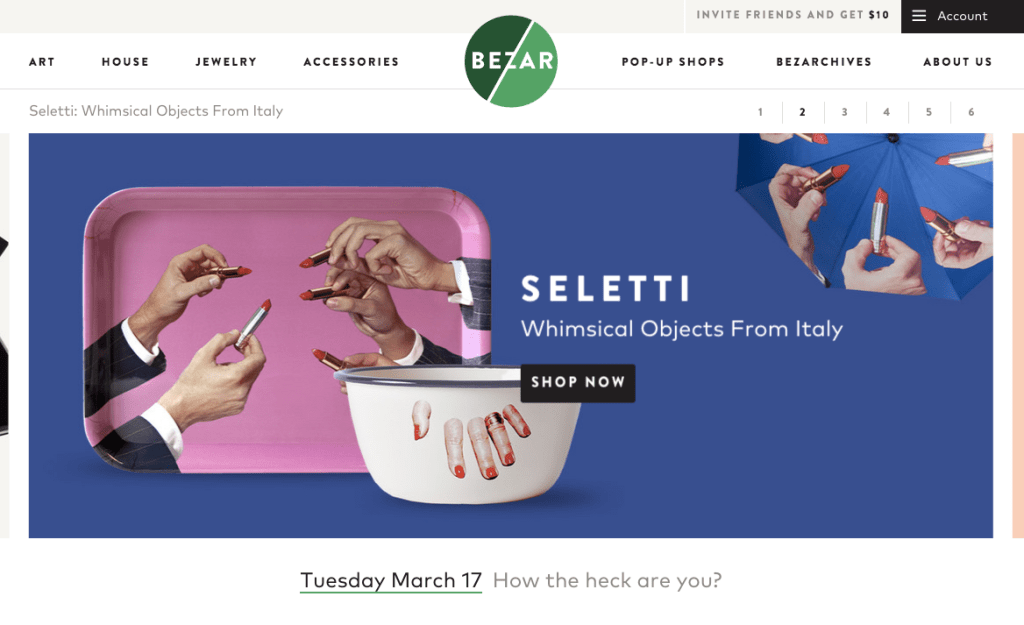 Bezar was founded by Bradford Shellhammer, cofounder of Fab.com who left in November of 2013, and took much of the “special sauce of Fab.com” with him when he left. I’ve visited Shellhammer’s home, with pink living room walls and a black kitchen and so many brightly colored knick knacks that the eye has trouble focusing on any one thing.