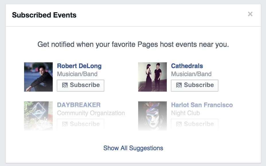 You don’t want to miss your favorite band’s concert in your town, even if you don’t care to see every one of their News Feed posts. To give you a hand and appeal to musicians by boosting their ticket sales, Facebook last night added an Events subscribe button to the Events section of all Pages on desktop and mobile. Once clicked, you’ll get a Facebook notification when that Page hosts an event near where you live.