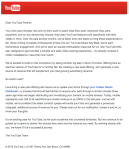 The full letter to YouTube partners is pasted below; screenshots of the email, terms and dashboard are above: