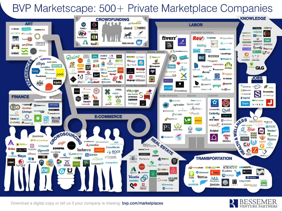 To encapsulate the magnitude of this shift, we assembled the Bessemer “Marketscape” – an incomplete illustration of the vast array of (U.S.-oriented) Internet marketplaces. We say “incomplete” because there are new marketplace companies emerging every day, and we’d like to add to the illustration over time (apologies if your company’s logo is missing – feel free to let us know).