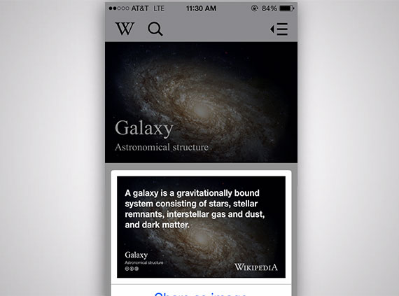 The app is also now going social with a feature that lets you create images overlaid with text from an article that can be shared with anyone via social media like Facebook, Twitter, Google+, email or text, and more. Previously released on Android, this clever addition lets you share a fact with your friends. It’s an attempt at making Wikipedia something that’s more fun and social – a toy of sorts, not just a tool.