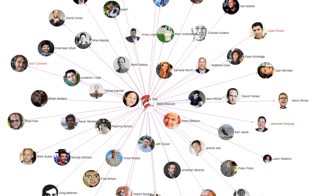 The tool then shows two interaction visualizations per person in the network — clicking on an individual’s photo toggles between an inbound and outbound map for them, displaying who they are speaking or listening to. The premise being to help entrepreneurs unearth well-connected angels/VCs within the tech-sphere.