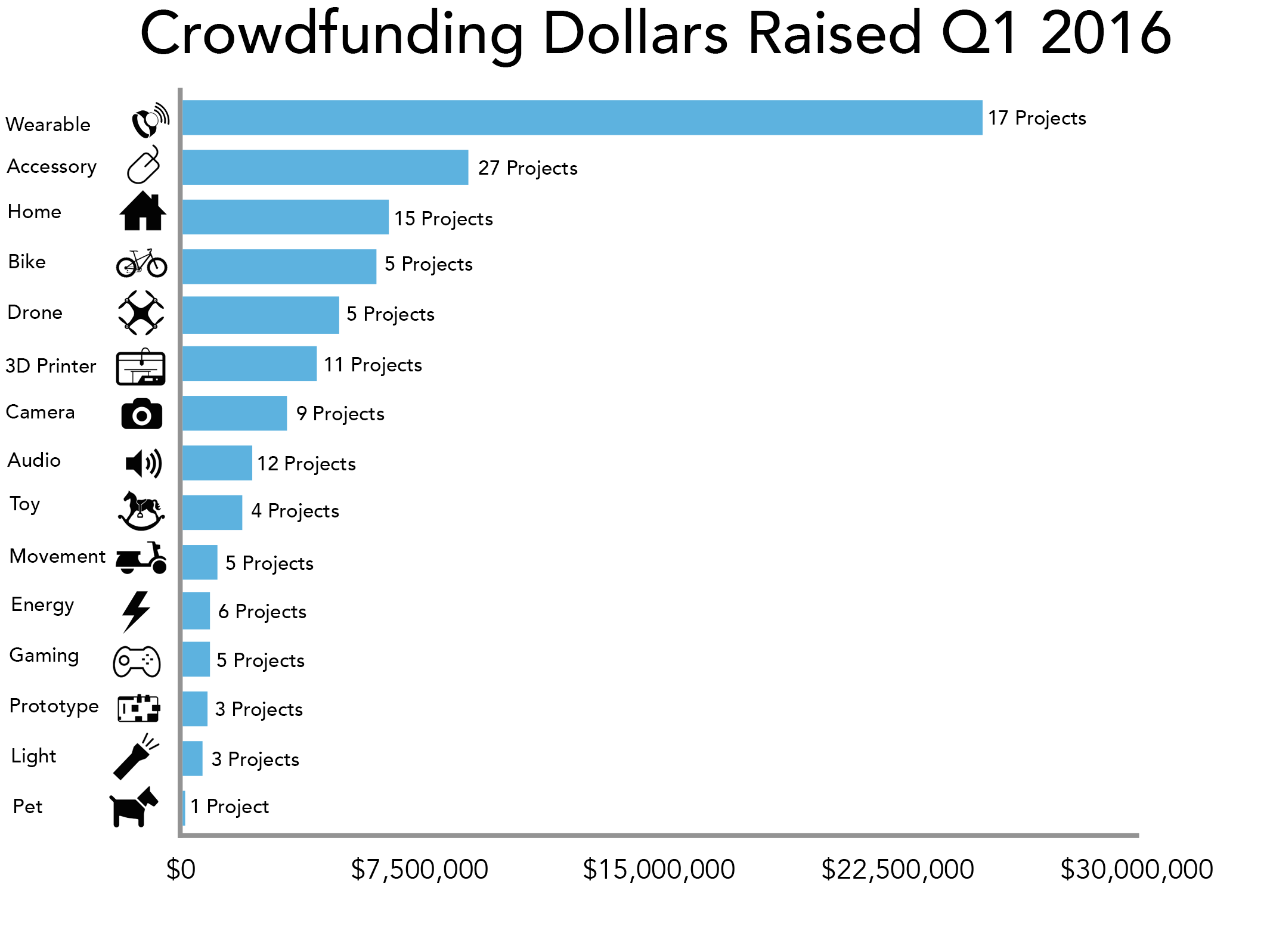 The accessory (devices that plug into computers, cellphones, tablets, etc.) and home (devices used for security, cooking, cleaning, etc.) categories both performed strong in Q1 with a total of 42 projects raising $15.6 million.