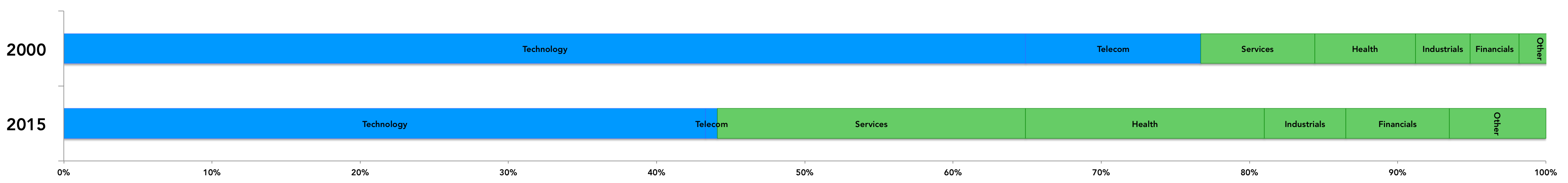 Diversification reduces risk. In 2000, the NASDAQ had 64.9 percent of its components in the technology sector. While in 2015, only 43.3 percent is from the tech sector. This reduces exposure to inherent volatility of technology.