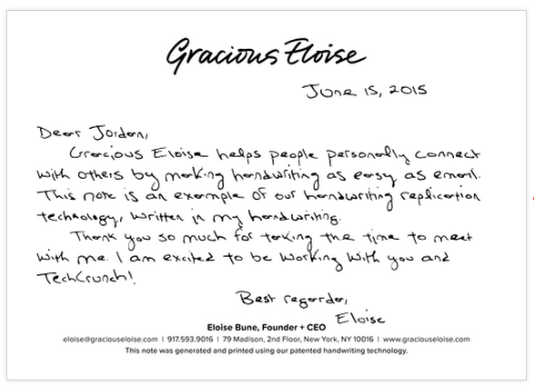 The early focus for Gracious Eloise is gift registries, greeting cards, ecommerce, CRM, direct mail, and digital (as in, hooking up your chat applications or email to the API to let you send digital messages in your own handwriting).