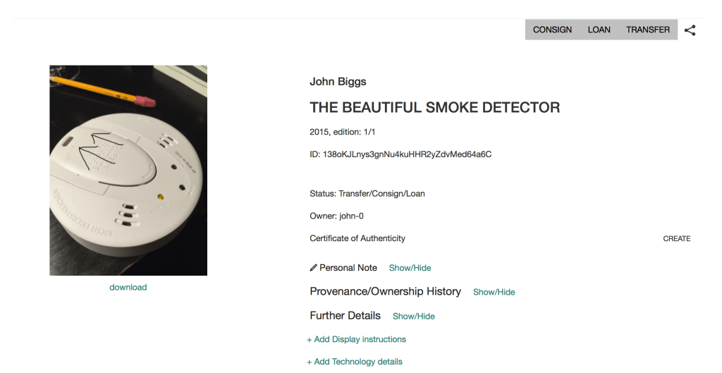 The company describes itself as a “notary and timestamp for intellectual property and creative works.” This means you can upload a digital image and state it is the definitive version. You can loan it out to people or even transfer it to another user. For example, I uploaded this photo of a smoke detector and now I can download a certificate of authenticity – really a public key – and watch where the file appears on the Internet. Sure you can make a copy yourself and run around selling it, but presumably I’d know about it thanks to Ascribe. The system uses the blockchain to store and sign each image, creating an immutable record of its existence.