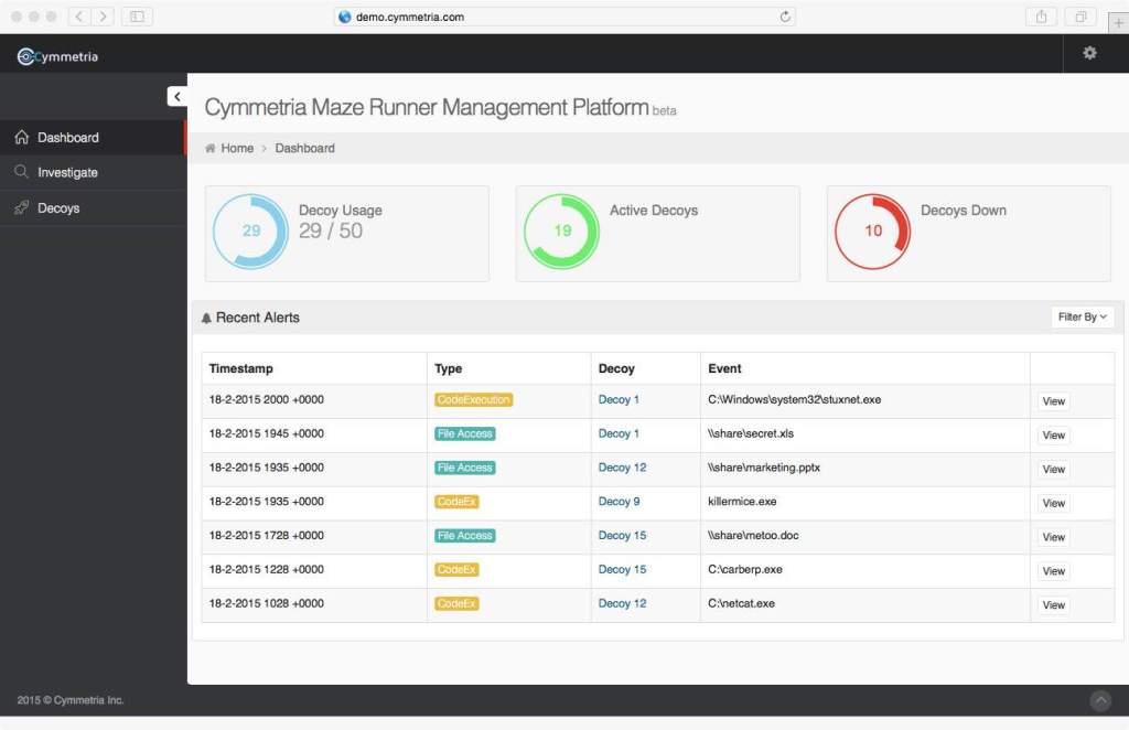 At that point Cymmetria also performs forensic analysis on the attack, and offers an action plan on how to mitigate it — using a company’s existing systems and security infrastructure, with which it integrates. It’s not the only decoy-based security startup out there but Evron argues the focus on integrating with a business’ operations and processes makes its approach distinct.