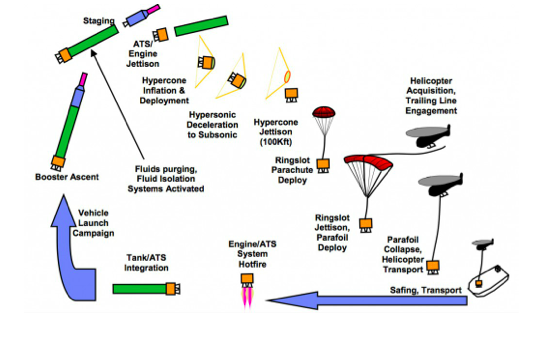 The Vulcan is early in the concept design phase, but will eventually be reused in a completely different manner than the Falcon 9. Rather than recovering the first stage from a vertical landing, it will attempt to capture the most expensive parts of the rocket in mid-air using a helicopter. This may sound crazy, but it is actually a technique the US Air Force used back in the 1960’s to recover film canisters from orbiting satellites.