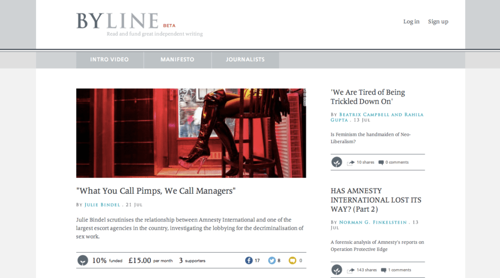 Early funding successes Byline points to include Andreou’s coverage of the Greek crisis reaching £1,000 monthly subscription within two weeks of launch; Finkelstein raising $30,000 within 10 days for a series of articles on Amnesty International and their role in the Israel-Palestine conflict; and Bindel raising £6,500+ to investigate the global sex trade.