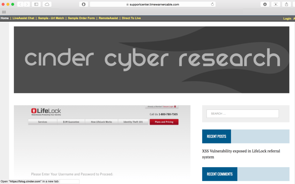 ) that will then load another URL into the main “frame” of the website where the customer support chat screen usually appears. They have run the exploit on a number of sites including Comcast, Time Warner Cable, Sage, CGI and Cognizant. The exploit, called a cross-site scripting attack, has been tested on each of these sites.