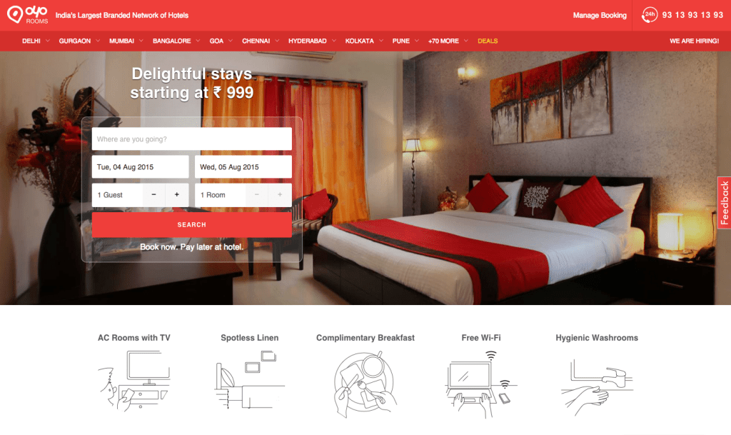 Unlike other companies in this space, like newly launched Wudstay or Airbnb/hotel site Stayzila, it focuses on convenience over exploration or explicit cost savings. That’s to say that, beyond being a platform for booking, OYO Rooms has standardized features across all of its accommodation — such as free Wi-Fi, free breakfast, air conditioning and more — which again ties back to its brand.