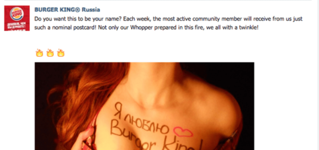 Most recently there has been a rash of “models will write stuff on their breasts” startups. One company, called Tittygram, even convinced the Russian minders of Burger King’s social media page to pony up a few dollars to have a model write “I love Burger King” on her chest. Burger King is a dark horse in the international burger race anyway, so it makes sense for them to be so stupid. It makes no sense for anyone else.
