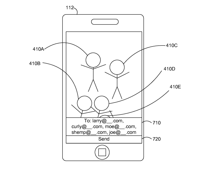 Multiple contact-linking and photo-sharing methods are covered in the patent, including letting users manually associate contact info with faces, and post to social networks as another way to distribute photos.