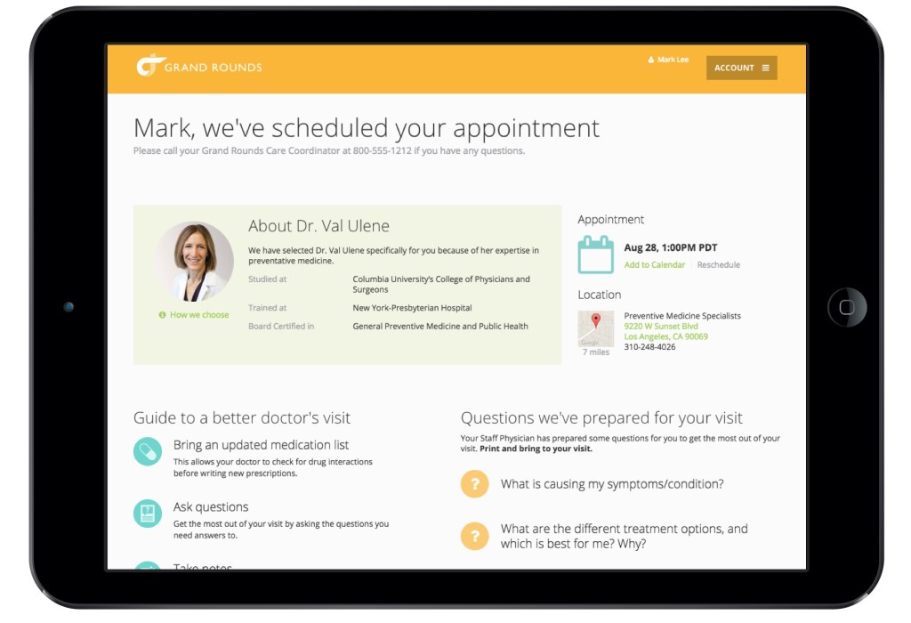 The process begins with an individual telling Grand Rounds what’s going on, and then giving the company a brief history of their condition. The individual then signs a release that allows Grand Rounds to collect medical data, like imaging and test results, to match that person to the right in-person care provider or remote expert. All of this can be done in a matter of hours, or even minutes, CEO Owen Tripp said.