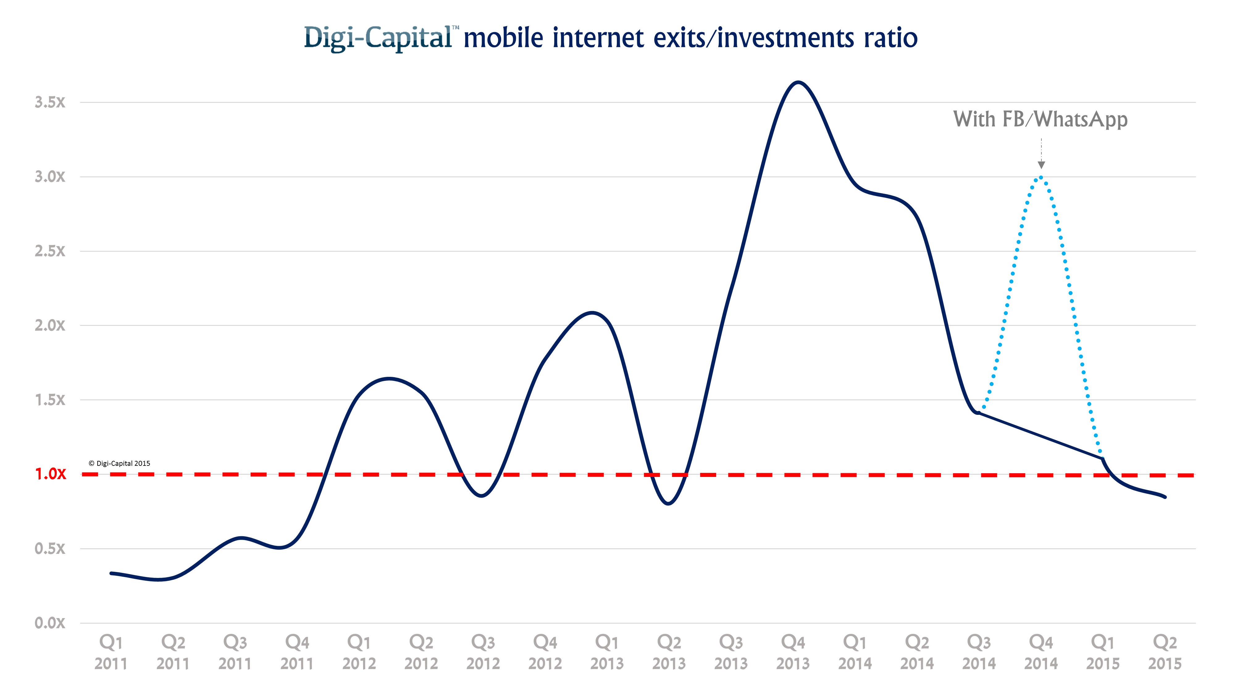 The last four quarters saw the ratio of exits to investments plunge dramatically (note: this excludes the outlier Facebook/WhatsApp deal), falling below 1x in Q2 2015. In other words, less money came back to mobile investors than went in the last quarter. What’s going on?