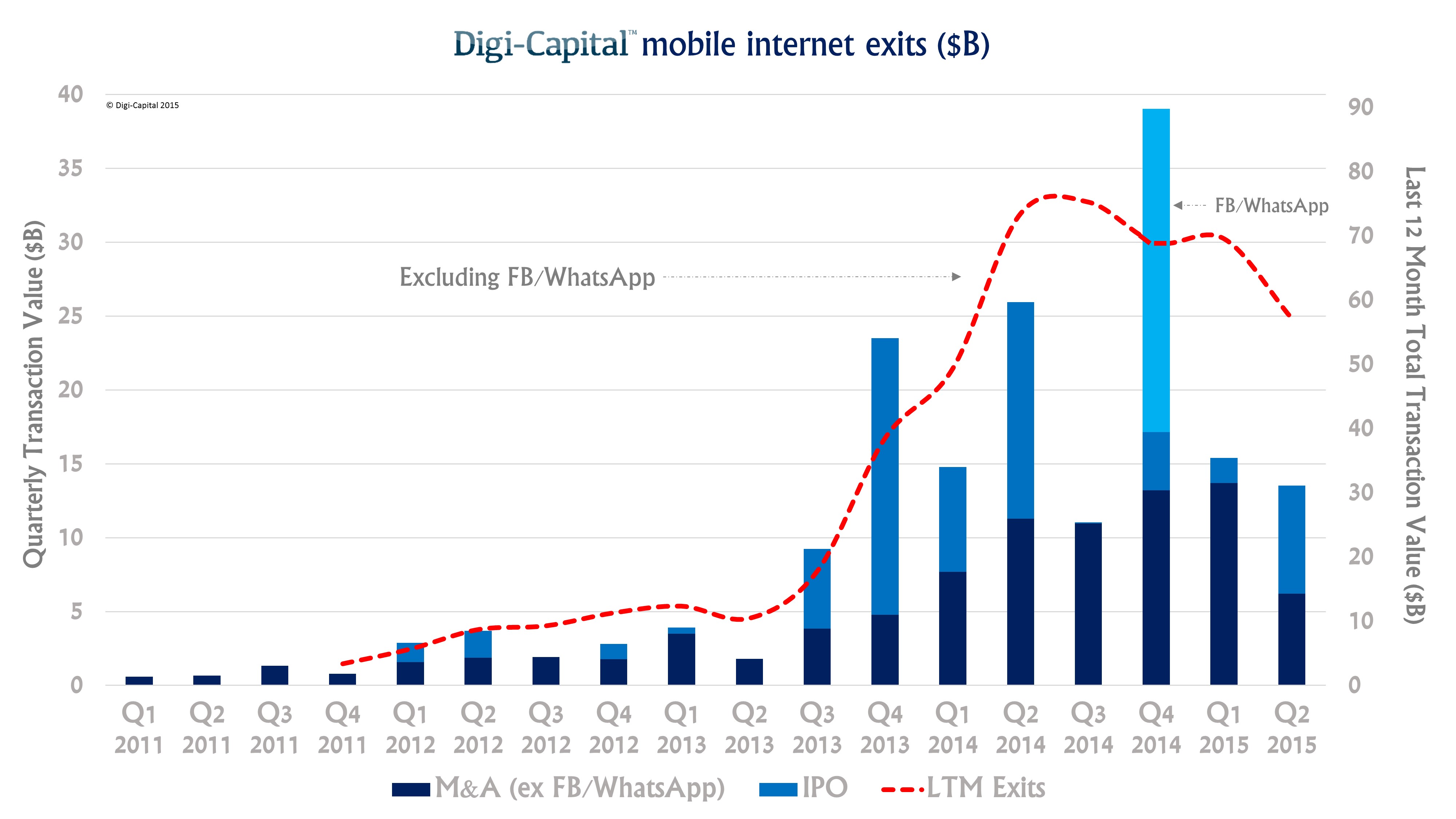 The mobile Internet exit (M&A + IPO) market stayed in the low single-digit billions of dollars per quarter from 2011 to mid-2013. It took off in the second half of 2013, cresting at just over $25 billion by the middle of last year.