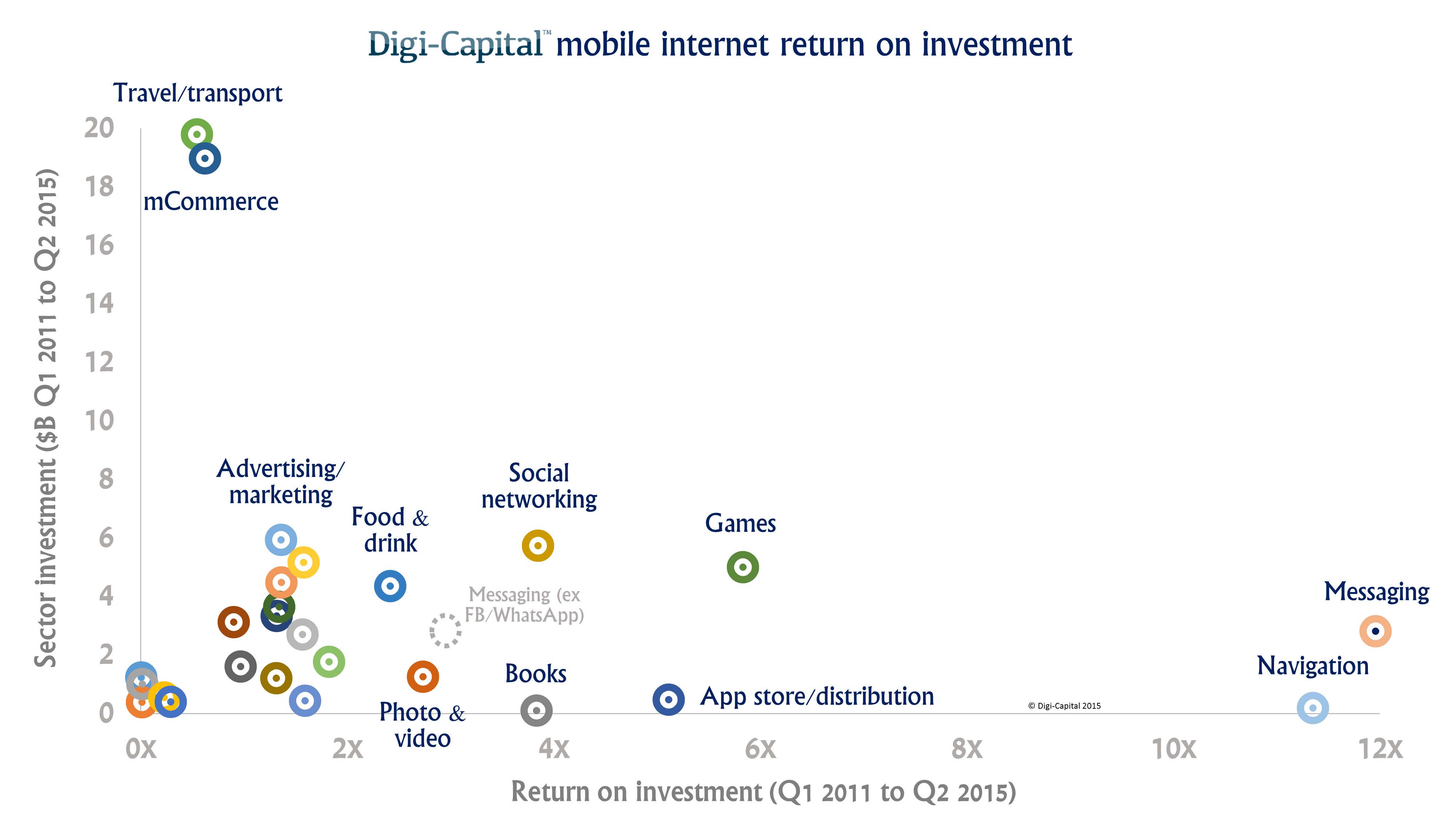 Mobile messaging returned around 12x (or 3x without Facebook/WhatsApp), navigation 11x, games 6x, app store/distribution 5x, social networking and books 4x and photo and video 3x on the $15 billion invested in these sectors in the last five years. Investors here are very happy bunnies.