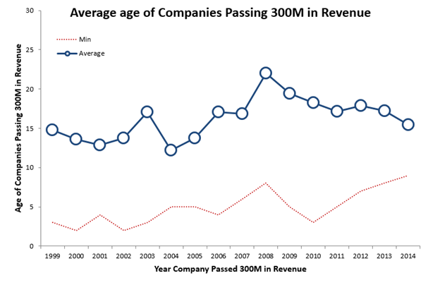 With those two data points, we could compare how long it took companies to grow. We expected to see the average age of companies passing the $300 million revenue threshold to be dropping. We didn’t.