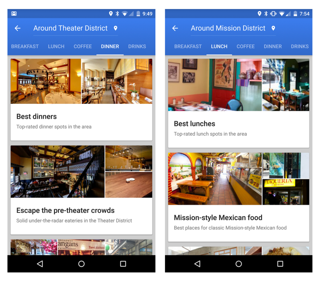 As you browse through the category recommendations, the app will also display ratings, reviews, and other details about the location. In addition, in some cases, the app will get even more personal – it may recommend a place that’s relevant to you because it’s popular with other diners who visited a place you’ve also been to in the past, says Google.