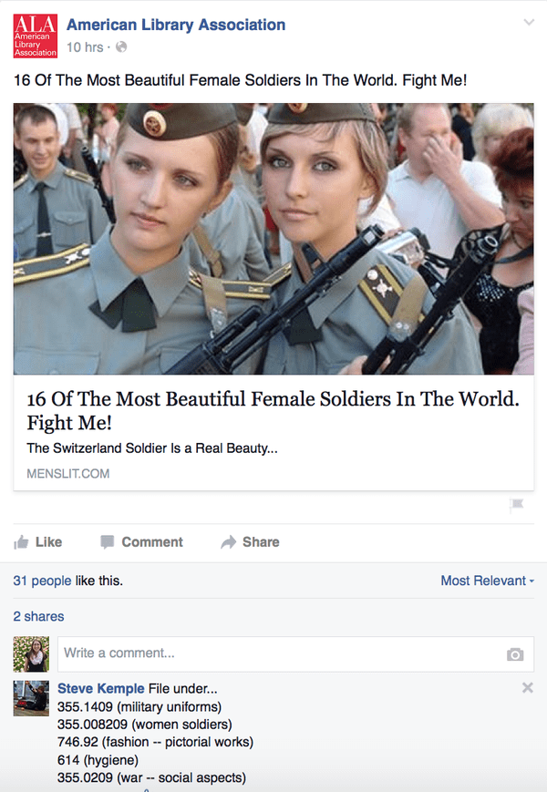 An ALA member, one Tobey Maguire, has collected some real gems. The librarians even asked the hackers to stay. Sadly, they couldn’t and page admin Tina grabbed the reins back on Monday morning.