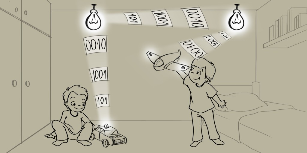 Because LED bulbs can be programmed the flash out binary codes the system could be implemented in older lighting systems and simply use a mesh network of visible light connections around, say, a house or collection of objects. Now the terrible kids toys your young ones want will have a reason for blinking and, with the advent of sound-based checksum systems, caterwauling like banshees.