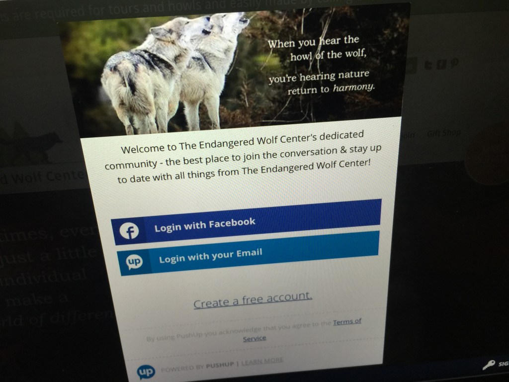 Pushup Social essentially adds a social media page to your web page. For example, the Endangered Wolf Center created a social community that lets them share photos, Instagram content, Tweets, and updates with a group of interested visitors. To connect to the system you simply sign in via Facebook or Twitter and then you become part of the action.